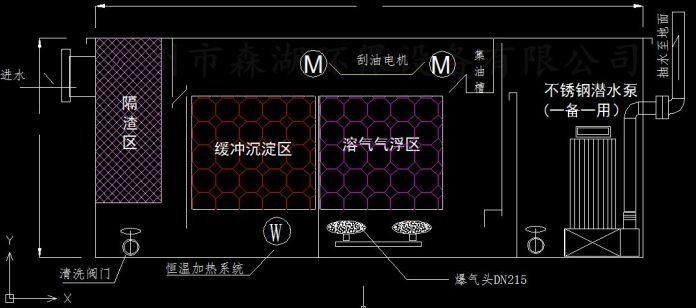 3. 污水流入油水分離腔,通過加熱使油污變得更有流動(dòng)性,通過刮油裝置把油刮除到排油槽,廢油從溢流堰自然流出由廢油收集桶收集起來(lái),定期清理廢油即可,這樣浮油得到去除。